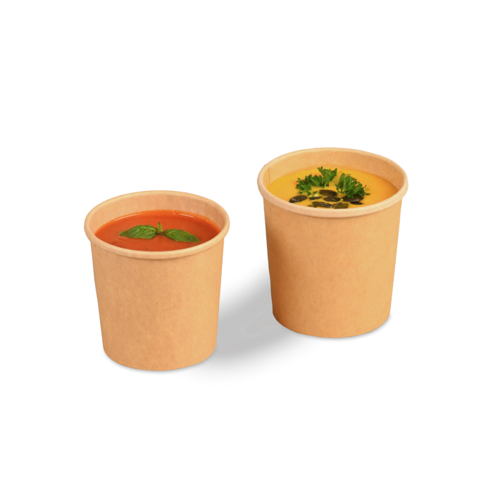 Der braune Suppenbecher aus Pappe ist besonders stabil und auslaufsicher dank hochwertig verschweißter Nähte. Perfekt für heiße und kalte Speisen wie Suppen, Eintöpfe, Nudelgerichte oder Antipasti. Ein passender Deckel ist optional erhältlich.