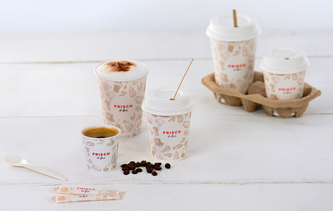 Si l'impression personnalisée est trop coûteuse pour vous, nous avons des alternatives adaptées. Découvrez d'une part nos collections de gobelets à café « FRISCH & fein » (frais et raffiné) ou « GENUSS » (plaisir), spécialement conçues pour souligner la qualité et l'ambiance de votre offre.