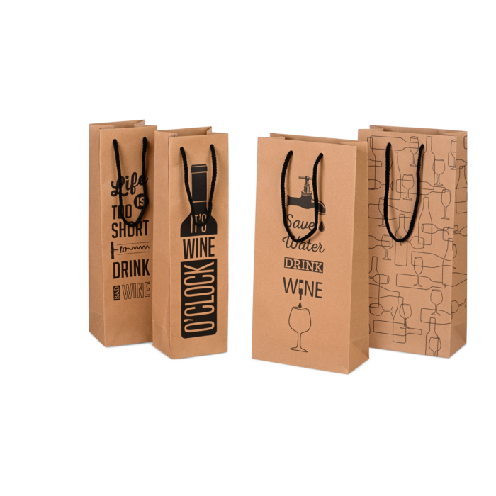 Stilsicheres Verpacken von Flaschen als Geschenk zu Geburtstagen, Jubiläen und anderen Anlässen. Die braunen Tragetaschen aus Kraftpapier mit attraktivem Druck und schwarzen Stoffkordeln sind perfekte Flaschen-Geschenktaschen. Die Taschen sind aus Papier gefertigt und fürs Transportieren von Wein, Sekt und anderen edlen Tropfen geeignet.