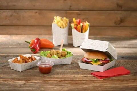 Vielseitig einsetzbare und schnell aufgerichtete Pommes-Verpackung aus fettabweisendem Karton. Auch ideal verwendbar als Becher für Snacks aller Art und Fingerfood wie frische Gemüse-Sticks.